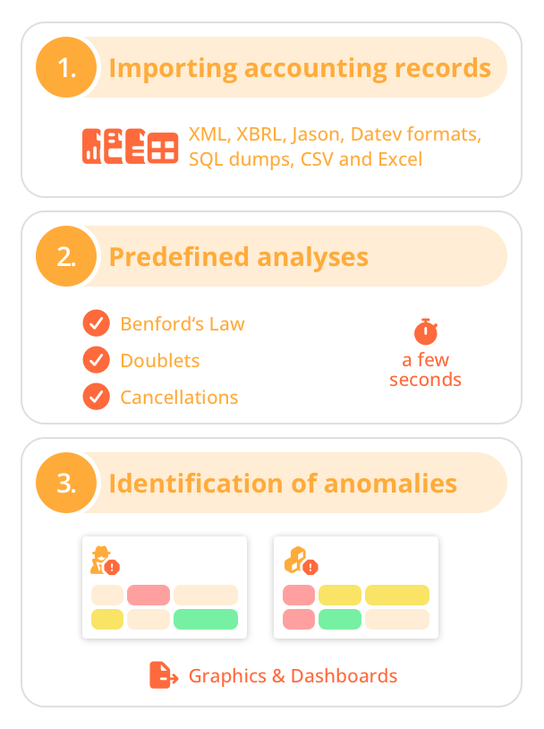 All stored analyses can be adapted by the auditor without any technical expertise. It is also possible to add custom analyses as needed. As a result, the auditing firm has a powerful risk analysis library at its disposal, which every auditor is expected to use. More information.