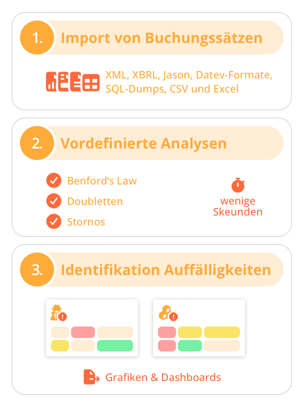Die KI untersucht innerhalb weniger Minuten alle typischen Fehlerfälle, Implausibilitäten und mögliche Delikte. Typische Beispiele hierfür sind ungewöhnliche Kontenkombinationen, Buchungen technischer Benutzer, eine auffällig hohe Anzahl von Stornos oder ungewöhnlich hohe und glatte Beträge. Zusätzlich wird eine optimierte Analyse von Benford’s Law durchgeführt. Weitere Informationen.